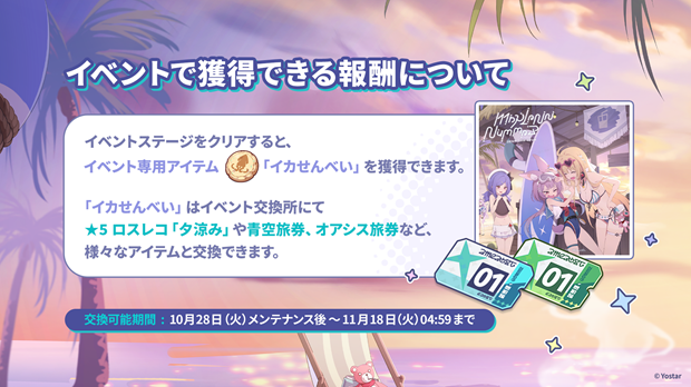 2025年10月28日(火)メンテナンス後より、イベント「キケン?冒険?蒼海の幽霊船伝説!」を開催する。巡遊者「シア」にまつわる「ストーリー」をお楽しみいただけるほか、イベント限定ステージをクリアすることで入手できるイベント専用アイテム「イカせんべい」を集めることで、イベント交換所にて★5ロスレコ「夕涼み」や青空旅券、オアシス旅券などのアイテムと交換することができる。またミニゲーム「ラッキーシャベル」もあわせて実装される。イベント任務で獲得できる「ラッキーシャベル」を使用して砂浜のマスを掘っていき、埋もれているお宝を発見することで獲得できるポイントに応じて、様々な報酬を獲得することが可能だ。