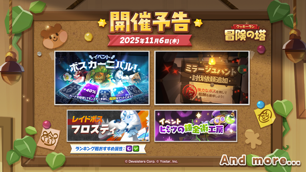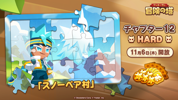 株式会社Yostar(代表取締役 李 衡達 / 所在地:東京都千代田区)は、デヴシスターズ(株)(代表 チョ・ギルヒョン / 所在地:韓国ソウル市)が開発する『クッキーラン:冒険の塔』において、2025年11月6日(木)データ更新後より、ストーリーチャプター12「スノーベア村」HARDを開放した。さらに「ゴートハムの呪詛挑戦イベント」など各種イベントも開催する。