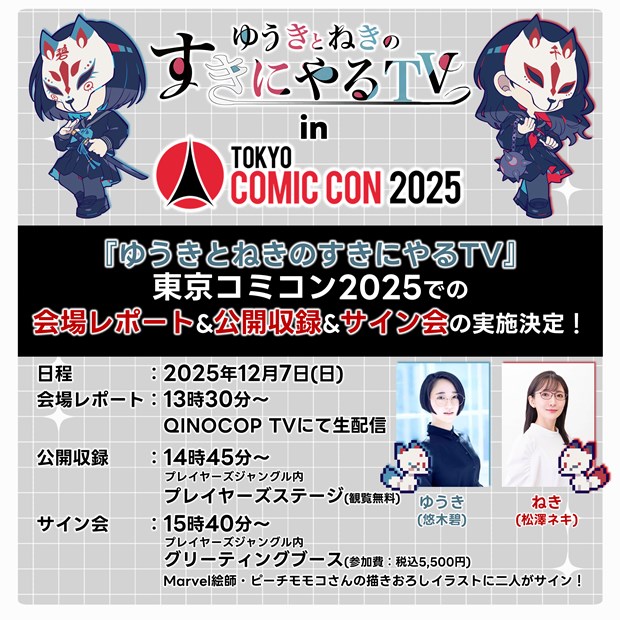人気声優・悠木碧氏とフリーアナウンサーの松澤ネキ氏による”統合思念体「ゆうきとねき」がすきなものをすきに語り、すきな企画をすきにやる空前絶後のYouTube番組「ゆうきとねきのすきにやるTV」(Youtube チャンネル「QINOCOP TV」にて大好評配信中)の公開収録並びにサイン会の実施が決定! 東京コミコンでしか見られない“すきにやる”時間をお届けします!