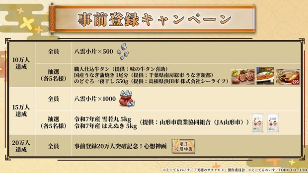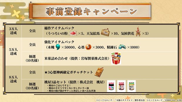 本作の事前登録件数に応じて、サービス開始時に豪華アイテムをプレゼント! 全員がもらえるゲーム内アイテムのほか、抽選で米や米菓、ご飯のお供が当たるチャンスもあるので、お楽しみに!