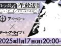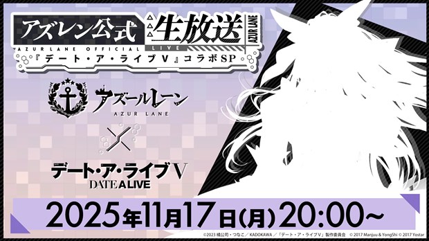 2025年11月17日(月)20時より、「アズレン公式生放送 -『デート・ア・ライブⅤ』コラボSP-」を実施することが決定した。本番組では、『アズールレーン』とTVアニメ『デート・ア・ライブV』とのコラボに関するさまざまな情報などを、スペシャルゲストとしてTVアニメ『デート・ア・ライブV』から「鳶一折紙」役の声優・富樫美鈴さん、「時崎狂三」役の声優・真田アサミさんをお招きしてお届けする。さらに、配信当日はSNSでの視聴者プレゼントキャンペーンも実施予定となっている。