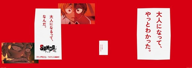 大人と子どもを行き来する主人公・三田になぞらえて、「大人になるって、なんだ。SANDA」をテーマに広告を展開。大人の目線から、「大人になることとは?」「大人になるって、わるくないかも」とじんわり考えさせられるコピーを各駅ごとに掲載しています。