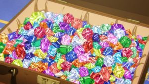 ムコーダが冒険者ギルドに査定をお願いしていたダンジョンの収穫物の中に、大量の宝石が入っていた。貴重な宝石のためすべてを買い取れないようで、ムコーダは副ギルドマスターのウゴールと共に、商人ギルドと取引することに。