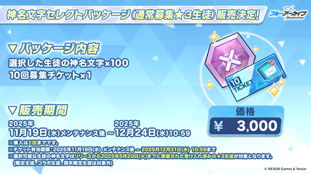 2025年11月19日(水)メンテナンス後より、新規パッケージ2種の販売が決定した。「アーカイブ募集★3セレクトパッケージ」および「神名文字セレクトパッケージ(通常募集★3生徒)」が登場します。1つのアカウントにつき各パッケージの購入回数が異なりますので、購入の際は詳細を確認ください。
