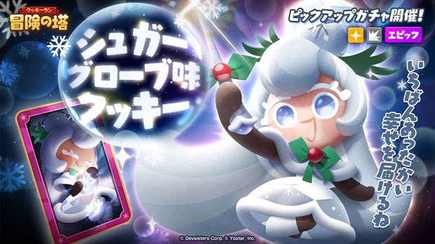 株式会社Yostar(代表取締役 李 衡達 / 所在地:東京都千代田区)は、デヴシスターズ(株)(代表 チョ・ギルヒョン / 所在地:韓国ソウル市)が開発する『クッキーラン:冒険の塔』において、2025年11月27日(木) 14:00より、ピックアップガチャにて「シュガーグローブ味クッキー」がピックアップ中だ。