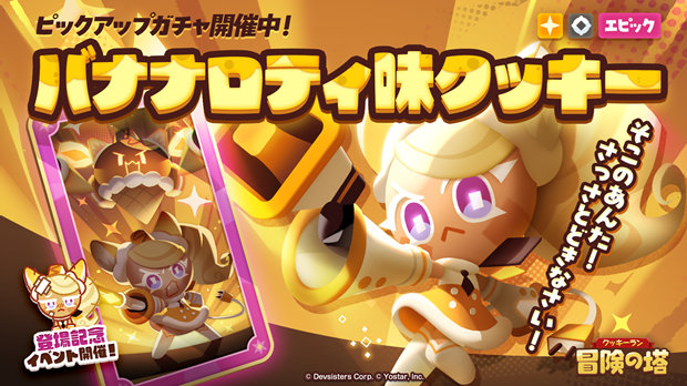 株式会社Yostar(代表取締役 李 衡達 / 所在地:東京都千代田区)は、デヴシスターズ(株)(代表 チョ・ギルヒョン / 所在地:韓国ソウル市)が開発する『クッキーラン:冒険の塔』において、2025年12月4日(木)メンテナンス後より、ピックアップガチャにて、「バナナロティ味クッキー」が新登場し、ピックアップ中であることを発表した。また「チャンピオンズレイド プレイイベント」や「黒水晶Ⅱ挑戦イベント」も開催中だ。