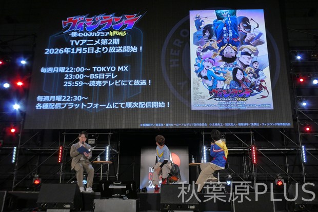 続いてヒロアカに続いて2026年1月から放送開始するヴィジランテの紹介となった。苦労マンと呼ばれる灰廻航一を演じる梅田さんから作品の紹介があった。アフレコが始まる前にかなり緊張していた梅田さんだったが、山下さんが背中をたたいてくれて頼もしかったと当時を振り返っていた。そして、第2期キービジュアルが公開となった。