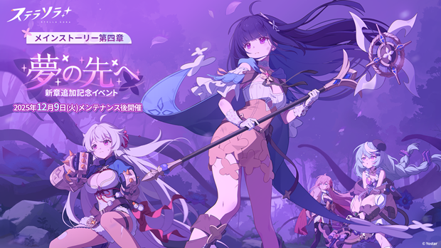 株式会社Yostarは、新作スマートフォン/PC(Windows)向けゲーム『ステラソラ』において、2025年12月9日(火)メンテナンス後よりメインストーリー 第四章「夢の先へ」を常設追加し、これを記念したイベント【夢の先へ-新章追加記念イベント】を開催。あわせて、★5新巡遊者「ナツカ」が先行実装で登場するピックアッププガチャ開催なども実施する。