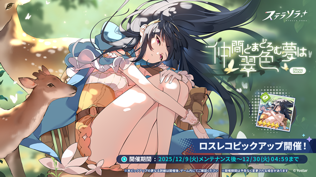 あわせて、ナツカをモチーフにしたロスレコ「鹿の声」が先行実装されるロスレコピックアップガチャ【仲間とまどろむ夢は翠色】も開催する。本「ロスレコピックアップガチャ」では、最大で120回ガチャを引くことで、必ず本ガチャのピックアップ対象★5ロスレコが排出される。
