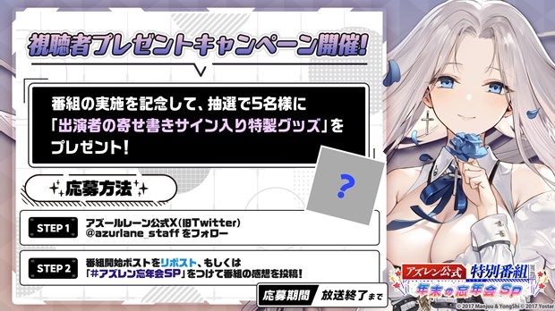 本配信の実施を記念して、「12月のアズレン公式特別番組-年末の忘年会SP-」の番組開始と同時に、抽選で5名様に「出演者サイン入り特製グッズ」が当たるSNSキャンペーンを開催予定。配信当日は本配信の番組ハッシュタグ「#アズレン忘年会SP」をつけての感想ツイートで一緒に盛り上がろう!