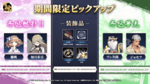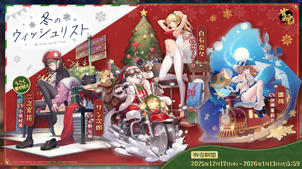 2025年12月17日(水)より、祈願でピックアップ中の雀士たちの新規着せ替え「ユキノソナタ」「雪間の春兆」を期間限定で販売する。また復刻着せ替えも登場します、この機会をぜひお見逃しなく!