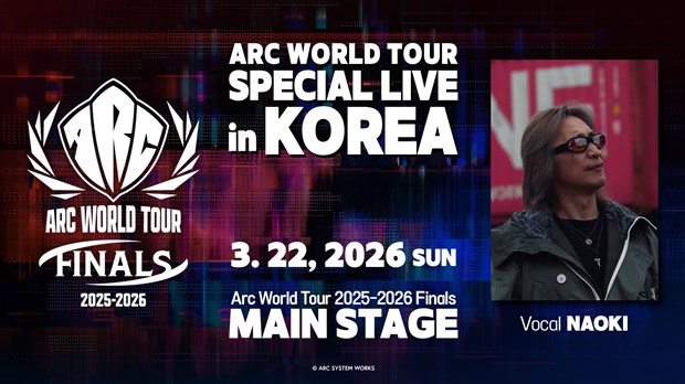『ARC WORLD TOUR 2025-2026 FINALS』にて、GUILTY GEAR -STRIVE- の主題歌やキャラクターのテーマソングでボーカルを務める「NAOKI」による『ARC WORLD TOUR SPECIAL LIVE in KOREA』の開催が決定した。韓国初のギルティギア公式ライブとなる本イベントは、大会最終日となる2026年3月22日に開催予定となる。ぜひ現地の大会の熱気とともにギルティギアのサウンドを楽しもう。