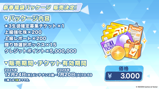 2025年12月24日(水)メンテナンス後より、新年を祝って、お得な「新春福袋パッケージ」の販売を実施中。「新春福袋パッケージ」には「★3生徒確定募集チケット×1」の他、生徒さんの育成に役立つアイテムが複数封入されておりますので、ぜひ購入を検討しよう!