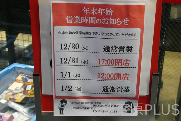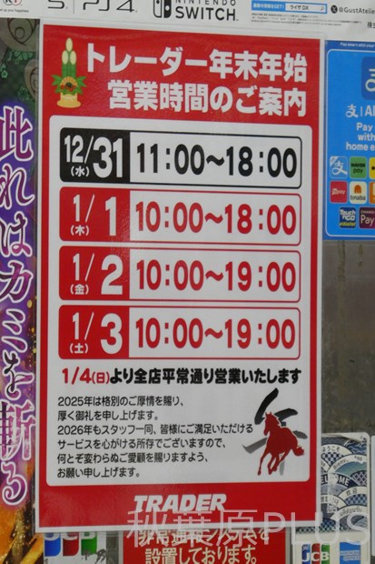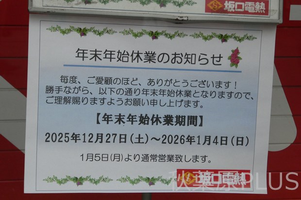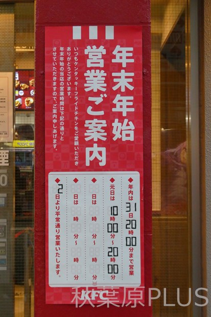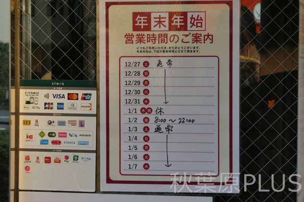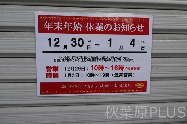 年末年始の気になる店の営業時間、今回は店頭に貼ってあるお店を探して一気に紹介していく。スタートは2k540からぐるっとめぐって最後は末広町駅に戻る形で紹介していく。だんだんと陽が落ちて暗くなっていくのも早くなった2025年年末、2026年の年始に向けて確認してみよう。