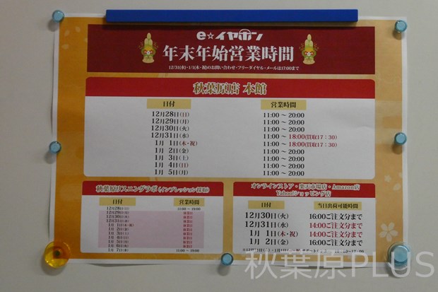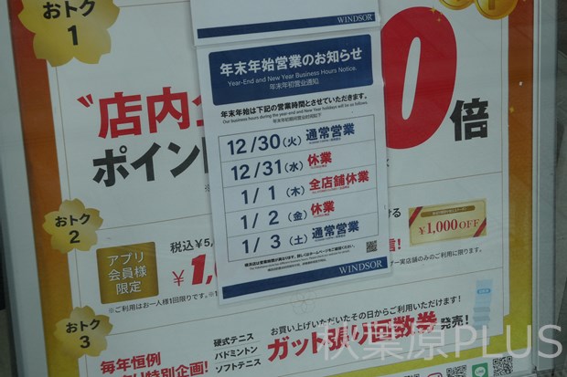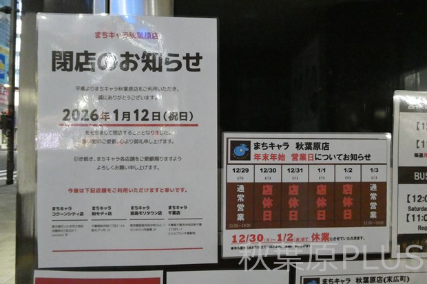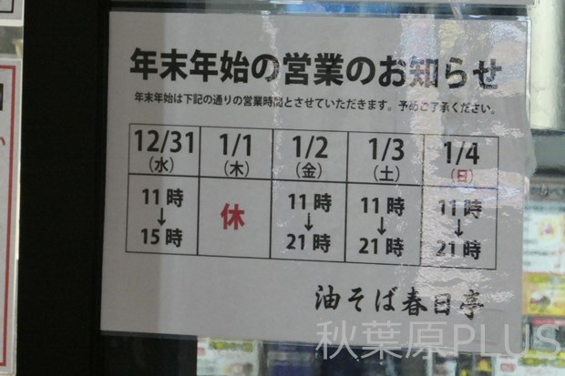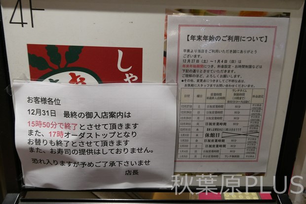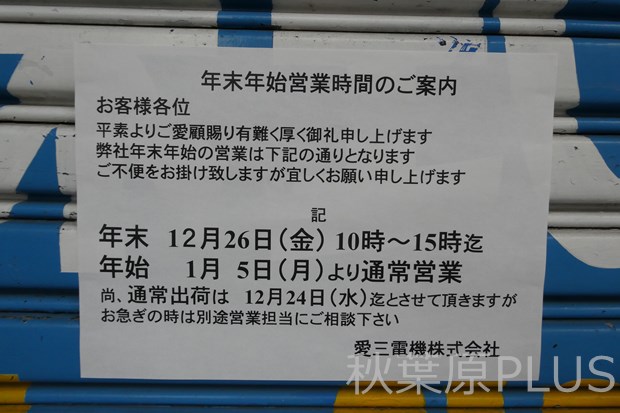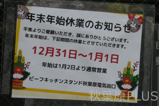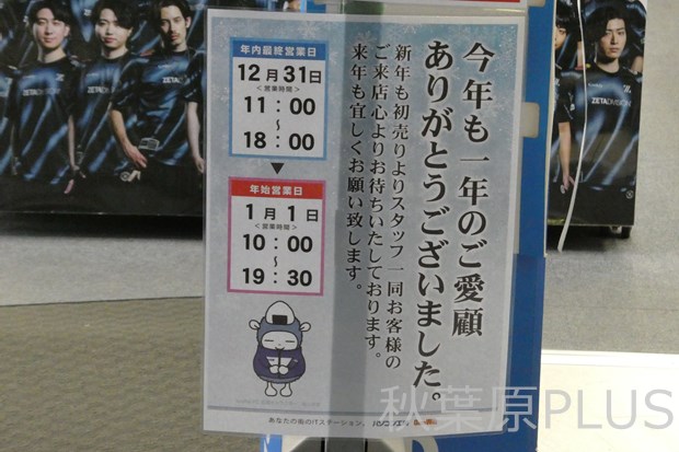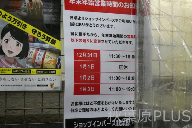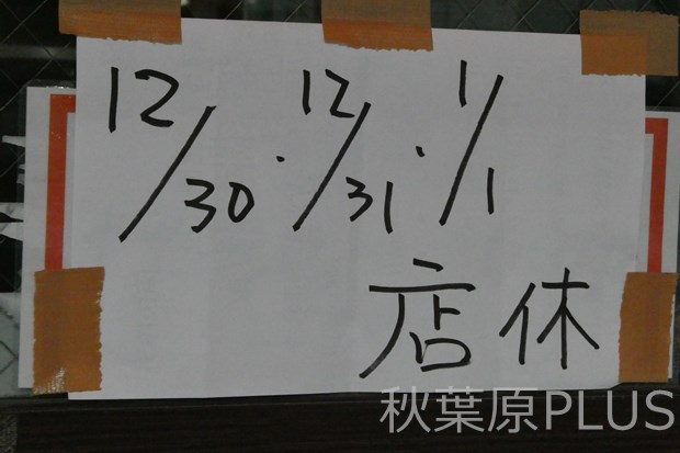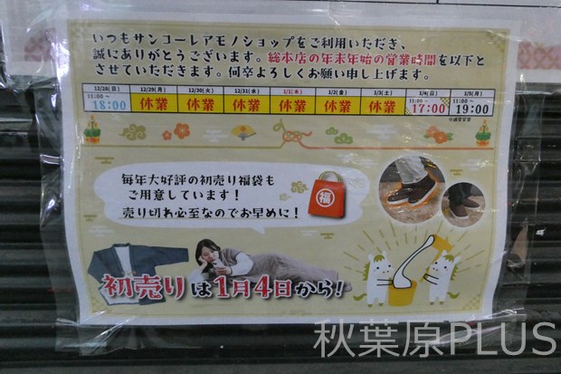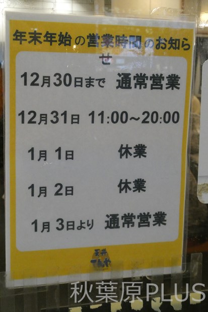そして最後はまちキャラの末広町駅前の店舗。閉店のお知らせに並べて年末年始の営業も貼ってある。1月3日から営業のようだ。