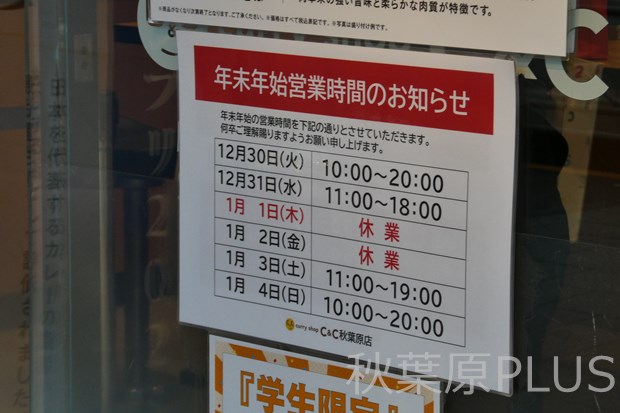 ドラッグストアも年末年始は休みが多いので注意したい。そしてカレーショップC&C。