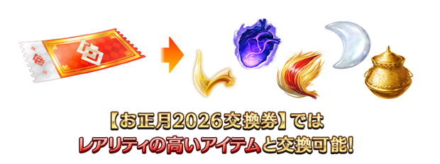 下記の期間中、「マスターミッション」の「限定」の項目内に「お正月2026交換券」が入手できるミッションが追加される。「お正月2026交換券」では、通常の素材交換券で交換できるアイテムよりもレアリティの高いアイテムが交換可能になる。