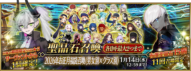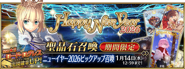 2026年1月1日(木)0:00から1月14日(水)12:59までの期間限定で「ニューイヤー2026 ピックアップ召喚」を開催する。2026年を迎えたことを記念して、新登場の期間限定サーヴァント「★5(SSR)ロード・ログレス」と期間限定概念礼装3種をピックアップする。さらに今回は、期間限定サーヴァント「★5(SSR)ファンタズムーン」「★5(SSR)アルジュナ〔オルタ〕」「★5(SSR)ビショーネ」「★5(SSR)ツタンカーメン」「★5(SSR)呼延灼(アサシン)」「★5(SSR)武田信玄(武田晴信)」「★5(SSR)メリュジーヌ(ルーラー)」「★4(SR)美遊・エーデルフェルト(キャスター)」「★4(SR)大黒天」「★4(SR)由井正雪」「★4(SR)徐福(アヴェンジャー)」「★4(SR)永倉新八」「★4(SR)UDK-バーゲスト」と、ストーリー召喚サーヴァント「★4(SR)アシュヴァッターマン」、および期間限定概念礼装3種をピックアップする7種類の召喚を期間毎に切り替わりで開催する。