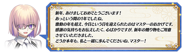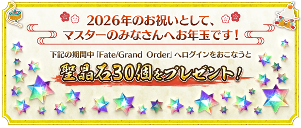 期間中『Fate/Grand Order』へログインしたマスター(プレイヤー)に、お年玉として「聖晶石」30個をプレゼント。