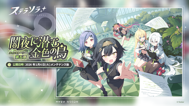 株式会社Yostarは、新作スマートフォン/PC(Windows)向けゲーム『ステラソラ』において、2026年1月6日(火)メンテナンス後よりメインストーリー 第五章「闇夜に潜む金色の鳥」を常設追加や、【ロアーナ 大討伐作戦】を開催することを公表した。