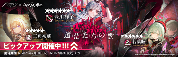 2026年2月10日(火)16:00より「アークナイツ × BanG Dream! Ave Mujica」コラボがスタート。『Ave Mujica』のメンバーである豊川祥子、三角初華、若葉睦をお迎えできる期間限定スカウトや、祐天寺にゃむ、八幡海鈴が加入するコラボイベントを開催する。