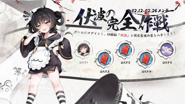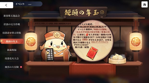 イベント期間中、5日間ゲームにログインすると、「饅頭の年玉」で開封できる「お年玉」と装備外装を入手できます。1日目報酬として艦船「伏波」を入手できます。