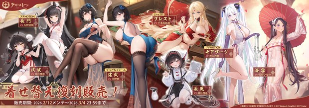 株式会社Yostarは、当社が運営しているスマートフォン向けアプリ『アズールレーン』において、2月12日(木)のメンテナンス後より、期間限定共闘イベント「新春珠玉逸品会」の開催を発表した。またあわせて、「フリードリヒ・デア・グローセ」たちの春節着せ替え7着の販売なども実施する。