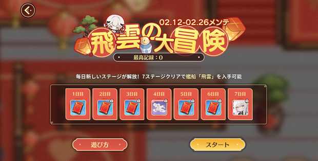 飛雲を操作し海籌たちから逃げながら、マップ上のアイテムを収集して得点を稼ぐミニゲームです。イベント開始後7日間、1日ごとに新しいステージが開放され、全ステージクリアすると、駆逐艦「飛雲」と限定装備外装を入手できます。