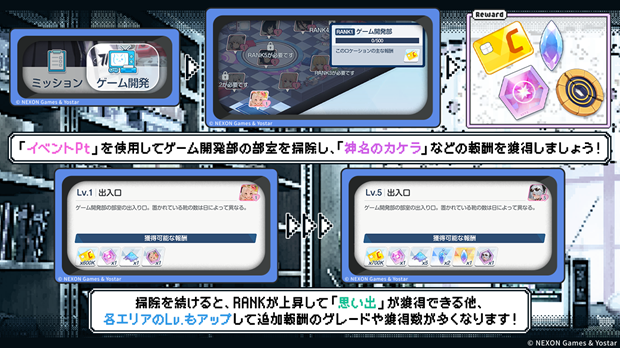 集めた「イベントPt」は、「ゲーム開発部」で使用して部室をお掃除することで、「神名のカケラ」など報酬のほか、累計獲得数に応じて様々なアイテムも入手できる。また、お掃除を続けて「ゲーム開発部」の部室がRANKアップすると「思い出」が獲得できる他、各エリアのLv.もアップして追加報酬のグレードや獲得数が多くなる。