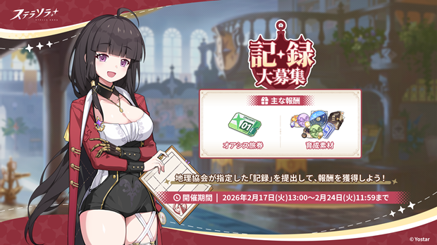 2026年2月17日(火)13:00より、イベント【記録大募集】を開催する。本イベントでは地理協会が指定した条件を満たす「記録」を開催期間中に提出すると、「オアシス旅券」や育成素材などの報酬を獲得することができる。