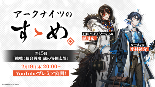株式会社 Yostar は、当社が運営するアプリゲーム『アークナイツ – 明日方舟 -』(以下、アークナイツ)の番組「アークナイツのすゝめ」第15回を、2026年2月19日(木)20:00より公式YouTubeチャンネルにてプレミア公開する。