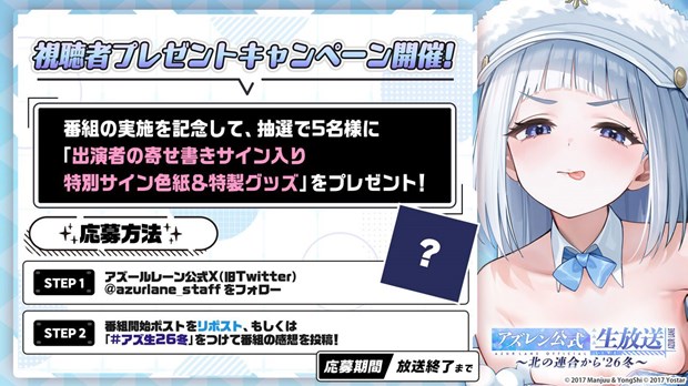 生放送の実施を記念して、「2月のアズレン公式生放送-北の連合から’26冬-」の番組開始と同時に、抽選で5名様に「出演者サイン色紙&特製グッズ」が当たるSNSキャンペーンを開催予定。配信当日は本生放送の番組ハッシュタグ「#アズ生26冬」をつけての感想ツイートで一緒に盛り上がりましょう!