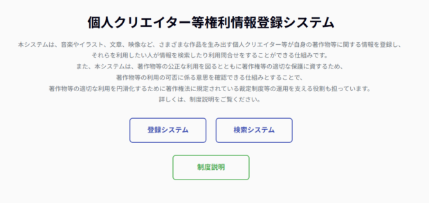 この「個人クリエイター等権利情報登録システム」は、著作物を登録してもらう事で、著作物を利用したい人が権利者にアクセスしやすくするためのシステム、らしい。令和8年2月24日から運用が開始となっている。