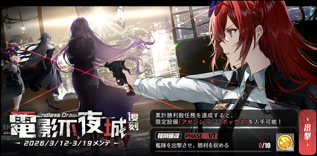 2026年3月12日(木)メンテナンス後より、ミニストーリーイベント「電影不夜城」復刻ライト版を開催する。累計勝利数任務をクリアし、限定設備「アセンション・ボックス」と報酬アイテムを入手できる。