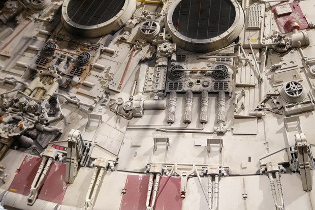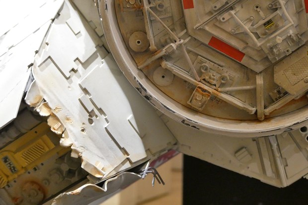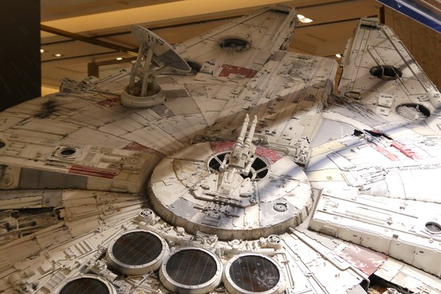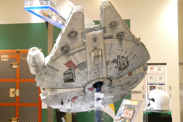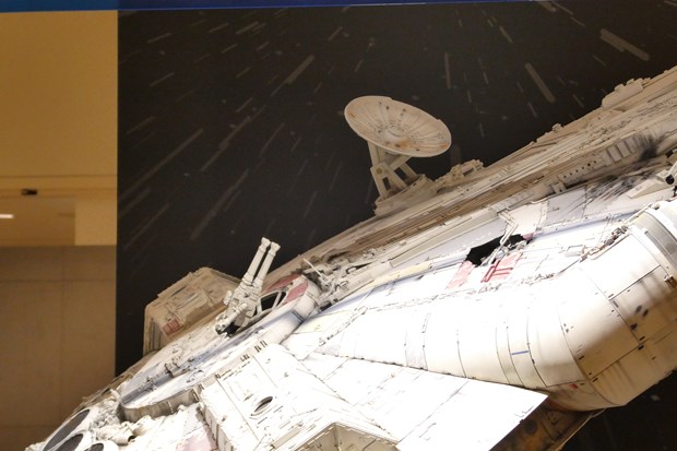 場所は分かりやすく本館1階のエスカレーター前。今回の目玉の一つでもあるミュージアム品質の大型ミレニアム・ファルコン号のレプリカが目に入ってくる。この大型ミレニアム・ファルコン号、アメリカから今回の為に移送してきたとの事。そしてこの展示後も3つに分解されて5月4日のオークションに望むという。まずはこのミレニアム・ファルコン号はしっかり見てほしい。裏面などは普段見ることが出来ない部分でもあり、また隕石や銃痕など様々な歴戦の傷がリアルに再現されている所を間近で見るまたとない機会となっている。