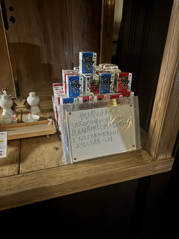 それがこの「おにころ」(鬼ころし)と、それを積み上げた「通称:おにころタワー」と呼ばれるもの。「花房稲荷神社」参拝者たちの一部に「おにころ」(と、名の付く紙パック日本酒)を奉納する者が激増。日本盛(ニホンサカリ)の「鬼ころし」を中心に、ミニ紙パック日本酒が奉納されまくった結果、最近ではタワーを形成することもしばしば。