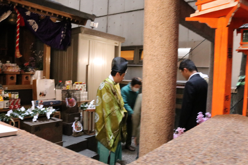 本年は昨年を上回る57人が参列(祭礼関係者を除いた参拝者の数)し、この規模の神社としては大変な賑わい。ビルの谷間に鎮座する小さな御社(おやしろ)はひとときの活気であふれました。