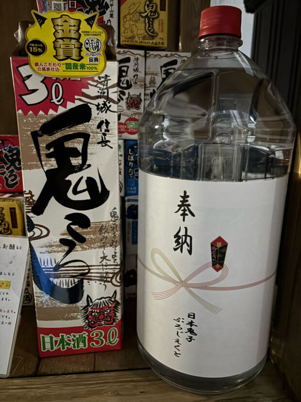 「鬼ころし」もしくは「鬼ごろし」と名の付く紙パック日本酒や焼酎は日本各地で製造されているために銘柄は様々だが、傾向として日本盛(ニホンサカリ)の「鬼ころし」の奉納が多いようだ。