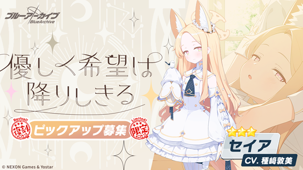 2026年4月1日(水)メンテナンス後より、期間限定復刻ピックアップ募集「優しく希望は降りしきる」、期間限定復刻ピックアップ募集「気ままな太陽は空の下」を開催する。トリニティ総合学園の生徒会「ティーパーティー」のメンバーの一人で、 トリニティ三大分派の一つ「サンクトゥス」のリーダーを務める「セイア」と、「ミレニアムEXPO」のガイドを務めるため、制服姿に着替えた「アスナ(制服)」の限定ピックアップ募集になる。