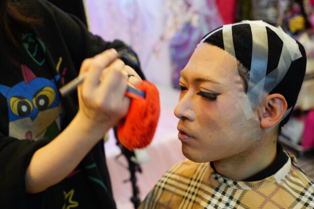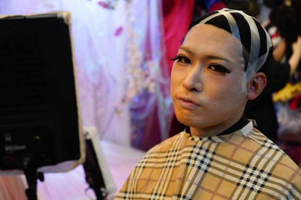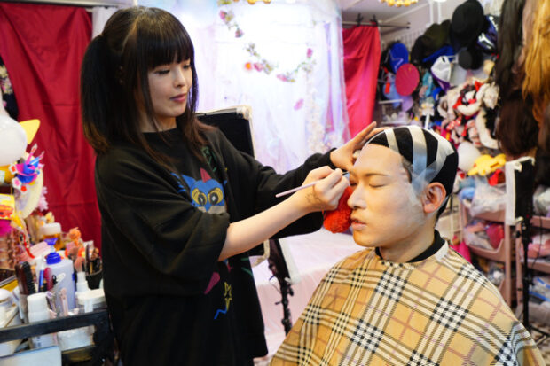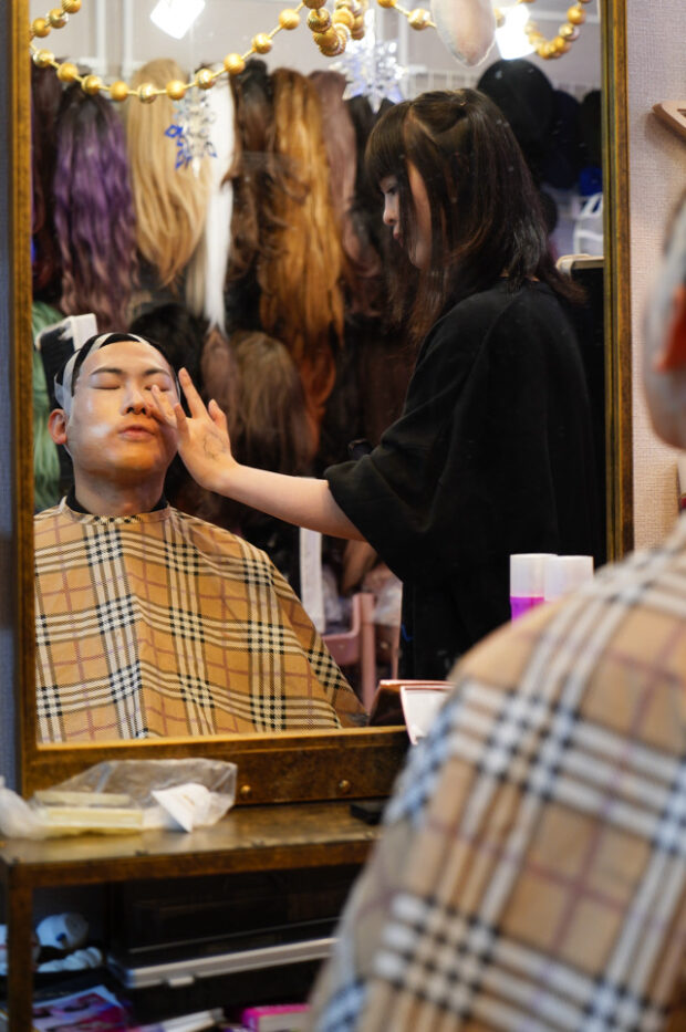 顔面の皮膚のリフトアップ目的で使われますが、男性と女性では顔面の骨格と肉付きが異なるのでテープを駆使して微調整。ただ貼っているだけにも見えますが、この微調整の具合がメイクのプロの腕の見せ所でもあります。