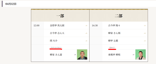 さて、ここまでは寄席に行く行き方やその心構えだった。映画に行く場合は「このタイトルの映画が見たい」から映画館を探すが、寄席の場合はどうすればよいのだろうか? 残念ながら演目に関しては落語家たちがその日の客の様子を見て変えることもあるので確約は出来ないのが難点の一つ。ただし、演目があらかじめ決まっている場合は演目が記載されている。下の画像は黒門亭のスケジュールから引用したが、赤いラインはこちらで引いたが、一部の最後の柳家さん遊師匠は「ちりとてちん」を演じ、二部の最後の春風亭柳枝師匠は「鼻ねじ」を演じるのは確実だ。他の噺家は何を演じるかはその時のお楽しみ、という形となる。どうしても聞きたい演目がある場合は各寄席のサイトで演者の情報をチェックするしかないのがちょっと面倒なところだ。