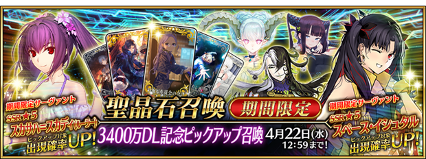 2026年4月8日(水)18:00から4月22日(水)12:59までの15日間、「3400万DL 記念ピックアップ召喚」を開催する。3400万DL 突破を記念して、期間限定サーヴァント「★5(SSR)スカサハ=スカディ(ルーラー)」を含む5騎をピックアップする5種類の召喚を開催する。さらに、今後ストーリー召喚に追加される概念礼装3種が先行登場するほか、★4(SR)および★3(R)概念礼装のラインナップを一部リニューアルした。