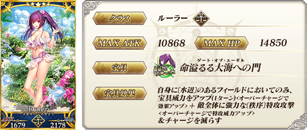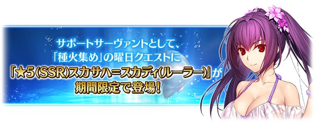 下記の期間中、期間限定で「種火集め」のクエストにサポートサーヴァントとして「★5(SSR)スカサハ=スカディ(ルーラー)」が登場する。