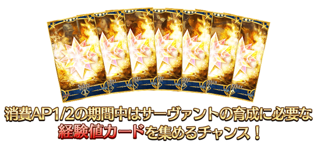 下記の期間中、カルデアゲート内に曜日ごとに出現する「種火集め」の消費APが1/2になる。(バトルにおいて撤退した場合でも、同様の消費量になります)さらに、「種火集め」を期間限定で全種開放する。