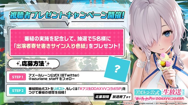生放送の実施を記念して、「4月のアズレン公式生放送-春のたわわな『DOAXVV』コラボSP-」の番組開始と同時に、抽選で5名様に「出演者サイン色紙」が当たるSNSキャンペーンを開催予定。配信当日は本生放送の番組ハッシュタグ「#アズ生DOAXVVコラボSP」をつけての感想ツイートで一緒に盛り上がろう!