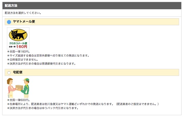 入力が終わって次の画面に進むと配達方法を選択する。今回はメール便を選択。あれ?メール便ってまだあるのかな?