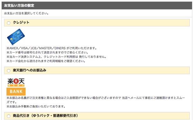 配達方法を決めたら、今度は決済方法の選択。代引きもあるのが嬉しい!