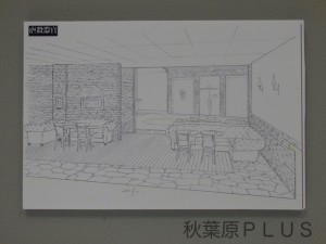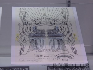 メインスペースには巨大な3枚のイラストがまず目につく。斜めに撮影しないと全景が入りきれない。