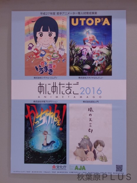 今回の「あにめたまご2016展」では4作品が対象となっている。会場の入口には今回の「あにめたまご2016」で作成された作品がポスターで展示されている。