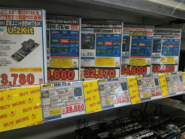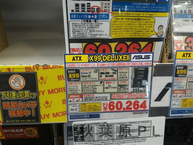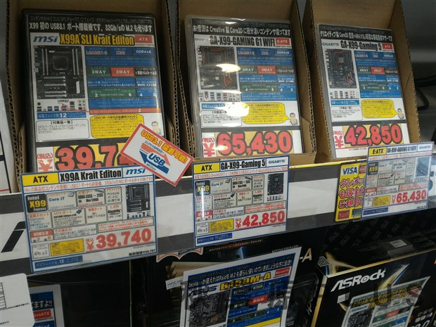 入荷数が少ないためかバイモア秋葉原本店では上位の6950Xと6900Kが、秋葉原のツクモ各店では6900Kが発売開始直後に売り切れとなっていた。ただ翌日以降、継続的に入荷があるようなのでお店のアナウンスに注目だ。今回発売になったコードネームBroadwell-Eはサーバーやワークステーションなどで用いられるCPUのXEONと機能が一部共通となっており、対応するチップセット/CPUソケットはX99チップセット/LGA2011-V3となっている。i5などで利用されているLGA1151(Z170、H170、B150、H110チップセットなど)や同じピン数のLGA2011-V1(X79チップセット)とは互換性が無いので注意してほしい。またプロセスルールが従来の22nmから14nmに微細化(シュリンク)されており、その分最大コア数が増える結果となっている。対応するマザーボードだがASUSやMSIが新しいマザーボードを発表しており、一部のショップでは既に入荷していた。今週末には各種入りそうだとの声もスタップさん達から聞けたので、併せてお店からのアナウンスに注目だ。また、既にX99チップセットのマザーボードを持っている場合はBIOS(UEFI)を更新することで使用が可能になる。